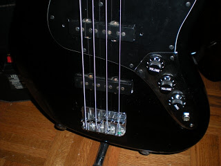 In this case, it’s a Mexican Fender Jazz Bass my friend picked up for a little over $200. I’ve never bought into the American vs. Mexican vs. Chinese/Japanese Fenders. I have a squire telecaster that is essentially identical to the American version. The neck is the difference – mine is ash as opposed to maple with rosewood fretboard. It has all new electronics, and now there is nothing that sounds like it. Typically a four string, Mexican Jazz Bass runs anywhere from $500 to maybe $750. So, $200 isn’t bad. And as I said, It’s tough to tell the difference. I build, repair, and play the things so I know from whence I speak. [Update: Squires are, in fact, not a fender product per se. The difference, other than the cheap hardware, is the scale is slightly shorter, making it impossible to use Fender parts, like a neck or bridge (for a telecaster)]