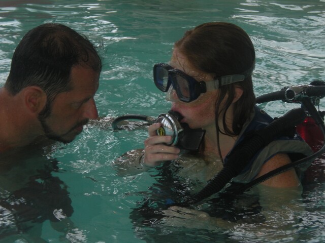 | John teaching Tara how to Scuba dive. He spent an afternoon with dozens of nieces and nephews showing them how to Scuba Dive |