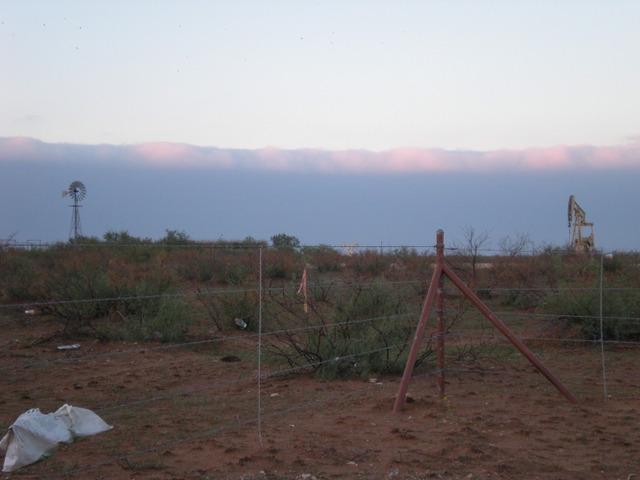 | Total West Texas, working windmill, oil pump, and cold front. |