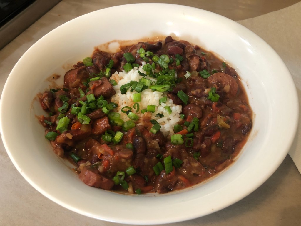 It’ll take 30-45 minutes for things to blend and the liquid to reduce somewhat. Some of the beans will break down and you’ll have beans in a rich sauce. If you have a thicker sauce going and the beans are ready, add green onion, stir and serve with rice.
