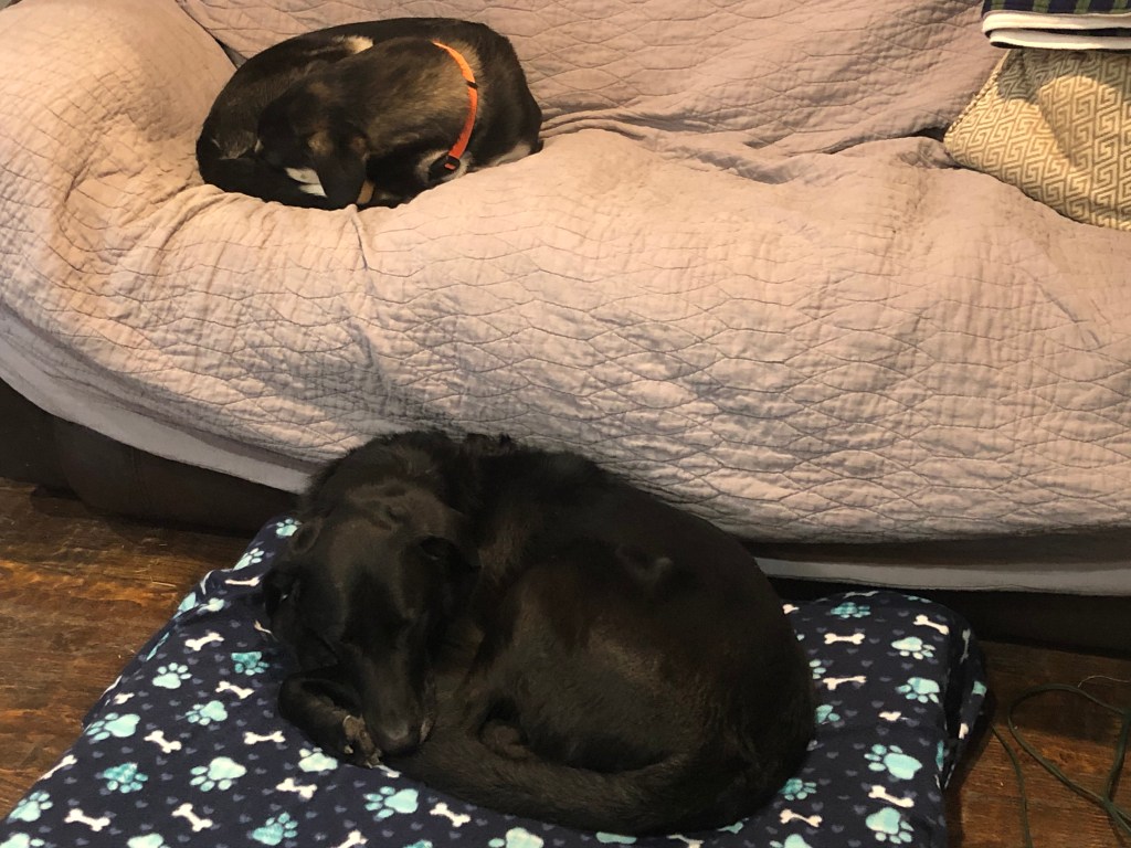 When the cold and ice happen next week and I get the dumb idea to waddle out, I’ll take a cue from the pups and just simply curl up in my chair with my Kindle until it’s all over.