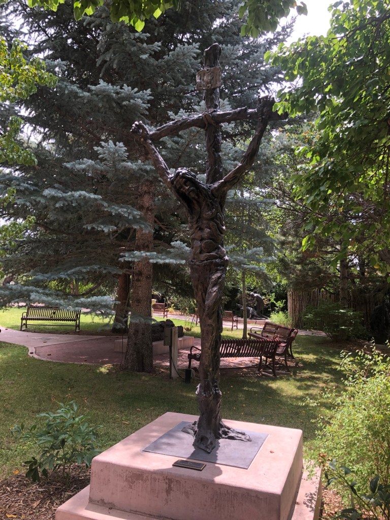 Coming back, we loaded up the car and took off for Santa Fe. Our flight was late in the afternoon, so we figured we mook about like tourists. Herself wanted to see the Cathedral and being a devout Catholic as I am, so did I. It sports a life-size depiction of the stations of the cross in an absolutely gorgeous garden. We stopped for lunch at a local place, then went back to the car to the airport. One of the funny things about Santa Fe, something I also noticed about Albuquerque, was that it was completely infested with retirement geezers of Boomer vintage as well as what appear to be hippies that gave up on California.