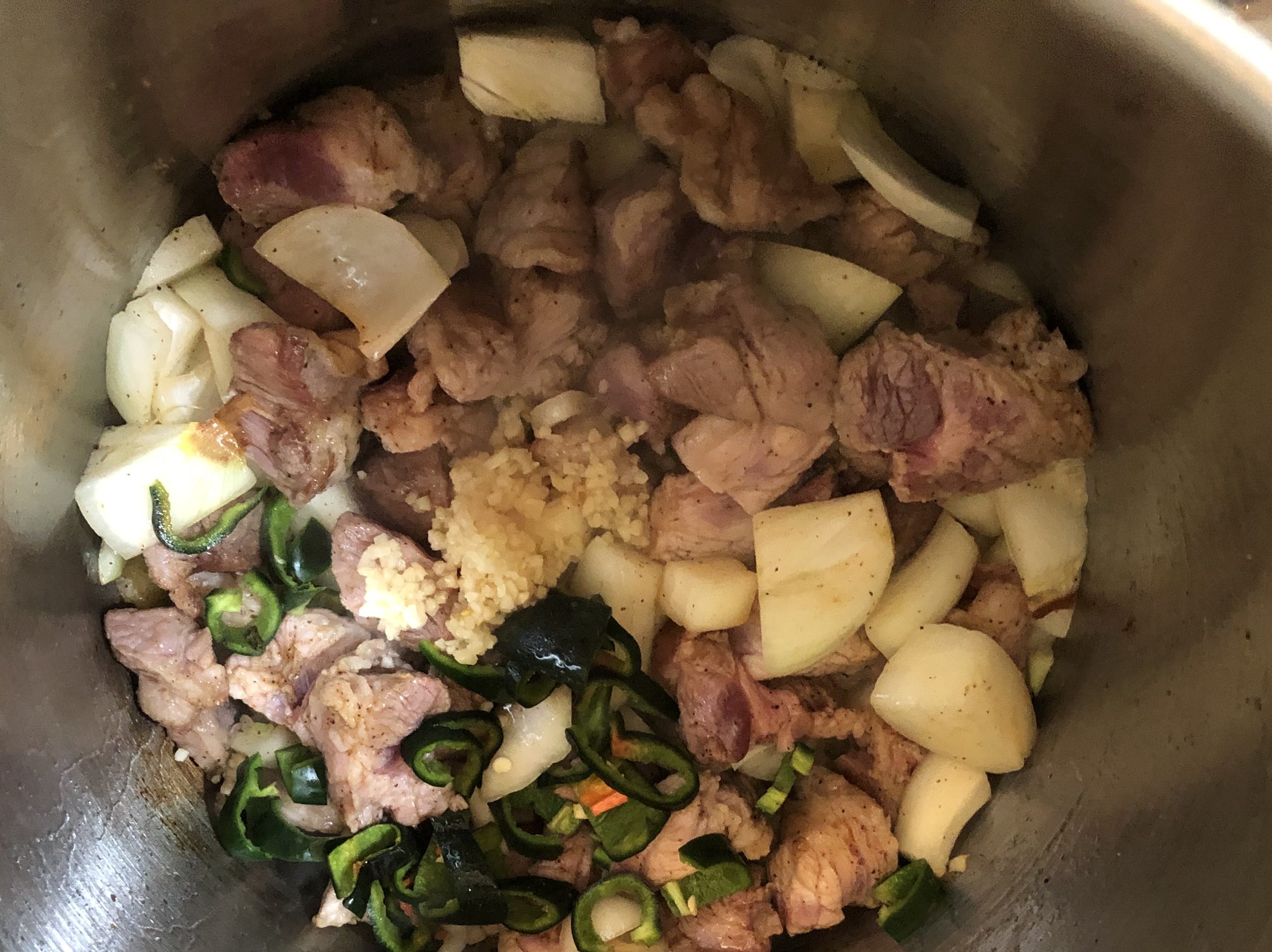 I used a cheap pork shoulder roast for this. You know the ones. The roast that’s assembled from the shoulder cuttings, and wrapped in butcher’s netting. It was just under $6. Good thing about this cut is it had a higher concentration of that dark, fatty pork meat you’ll need for a stew.