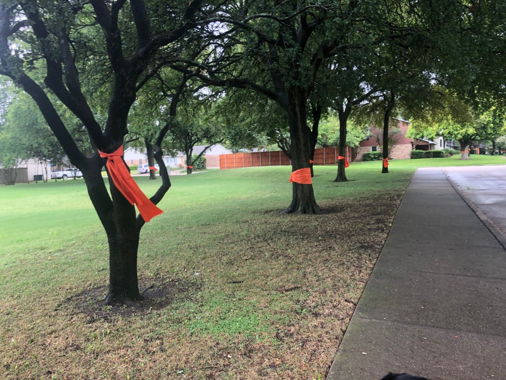 I was walking the dogs the other day and noticed orange ribbons tied on tons of trees in my neighborhood.
