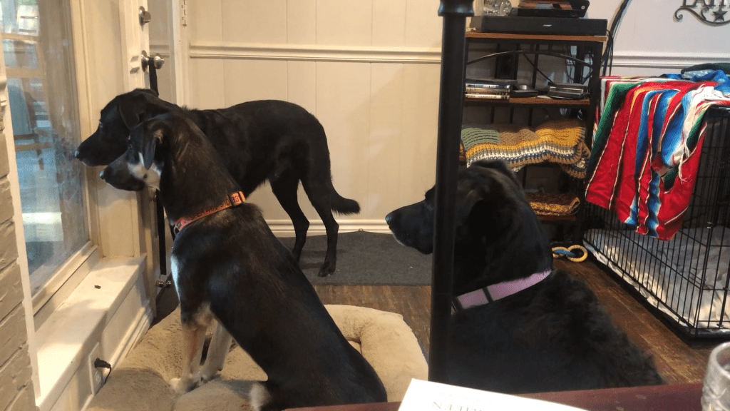 I really don’t want them outside the wire, so to speak, since our property borders a busy street. We’ve had a few panic attacks when we first moved in, and the dogs got out to explore. Both black dogs understand more than a few commands – sit, stay, come, down, night-night. But they don’t always listen when they are free in a new environment.