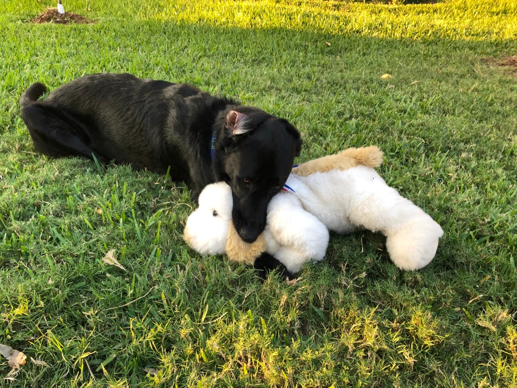 We had to recover that stuffed dog, which we bought for a grandkid, before it was destroyed. But the big dude had to have a cuddle first.