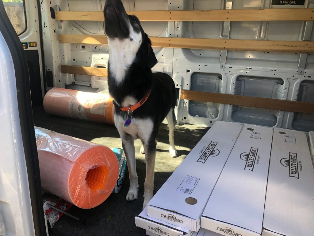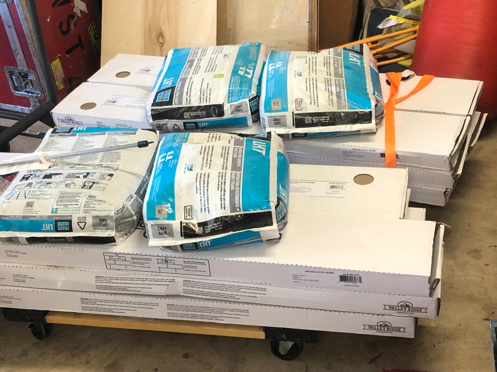 What you are seeing here is several hundred pounds (about 1500 of them, all said, if my calculations are correct) of porcelain tile flooring for the sunroom that Herself has been after me to pick up for weeks. It took most of the afternoon to load it, bring it here, and unload it. The real pain will start in a few weeks as I install it. I have a small window in December where I can do this, before we may get a cold snap that’ll make the job ten times harder.