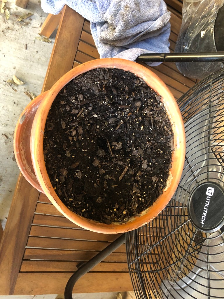What you see there is an empty pot where a cutting from a fig tree was rooting. I moved it there because I moved the shelf it was on in the yard to put it in the sunroom for the winter. It’s gone. Not even a crumb. Damn dog ate it. For whatever reason, they love fig leaves. Time to get them walking.