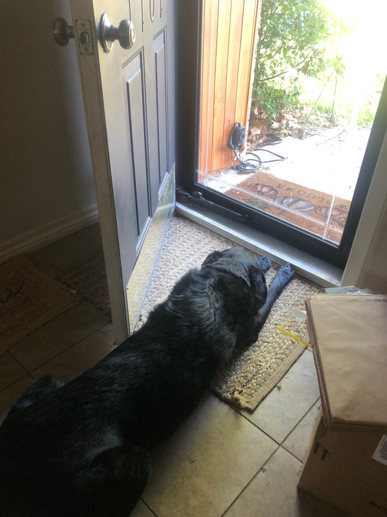 Jethro isn’t thrilled at strangers at the door and especially hates delivery dudes. Jethro is a big guy, I can see where you’d take a step back if he’s charging at you. Big black dog with shiny white teeth that badly wants a piece of you? Yeah.