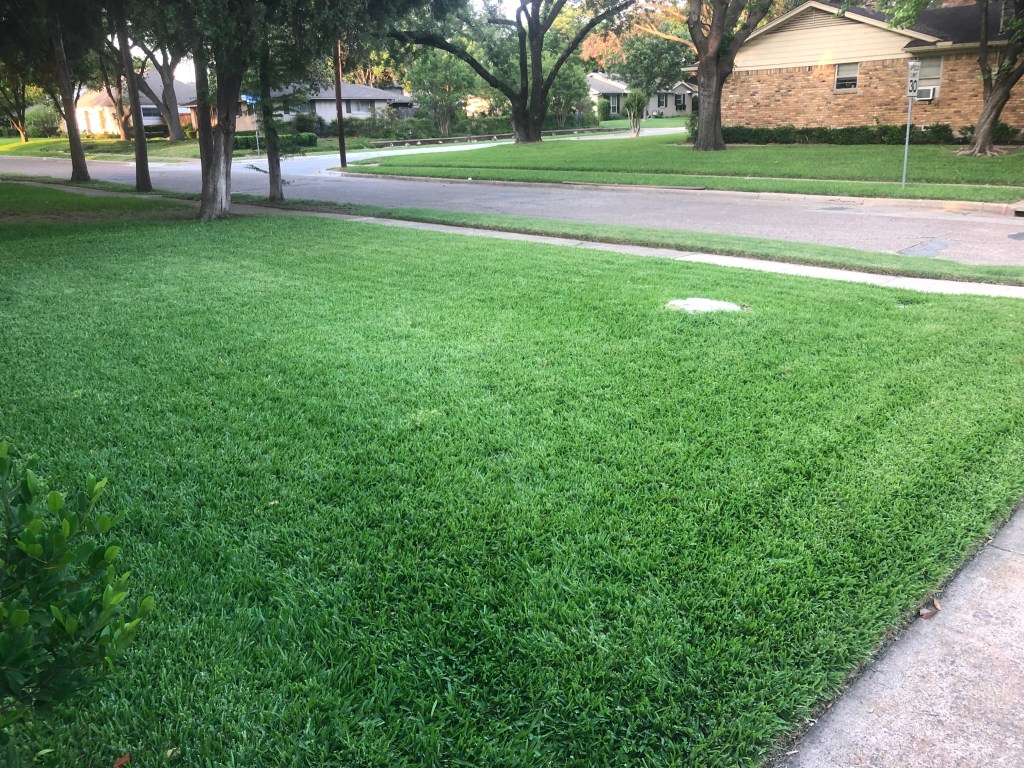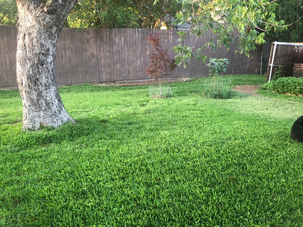 That dirt you see in the top right is actually cedar mulch that covers the dog path. There were bare spots a few weeks ago. But thanks to knowing what to do, the lawn is rapidly healing itself (Augustine grass does this, as does Bermuda to some extent). I planted “dog tough” grass plugs where you see that light spot. It’s taking over.