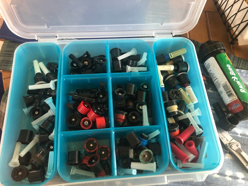 Turns out I had an extra plastic compartmentalized box I could use for sprinkler heads. So I put back the tools, fittings, and pop ups as well as hose parts back into the case and dumped the heads into the bucket you see on the left.