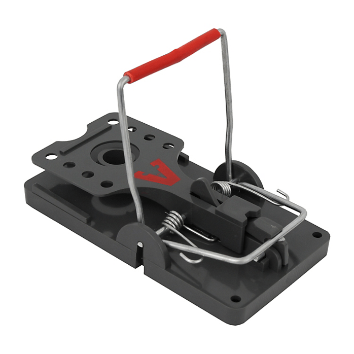 When I went to empty the other bag into containers, it had a decent hole in it as well. Jet was there ‘helping’ me clean up the spillage. I finally got it stored, put the bags in the can, and then later on I set a couple traps. The first one is the newfangled kind, made of plastic, with an “L” shaped trap bar, with plastic on the bar, and a little food tray surrounded by a ‘platform’ that triggers the trap. Like this one: