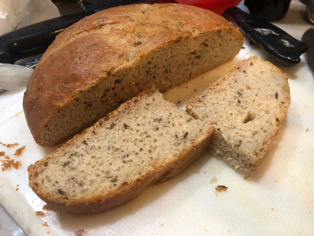 But, I followed the recipe and it said to divide the dough. That was a mistake. I should’ve stuffed it all into my cast iron bread pan. That said, it made a small square loaf, and a bigger nicer round one. The round one you see got wiped out that day.