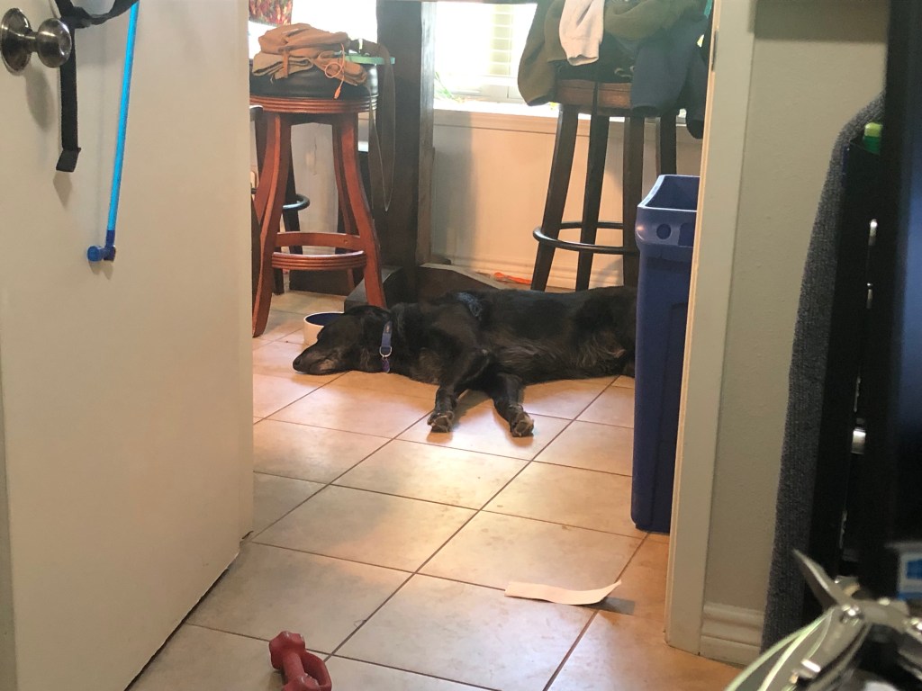 He’s such a good dude. Does NOT want to go in the house. So I get up, grab for some shoes, stumble to the door to let him out. He shoots out and vanishes into the dark to do his business. Usually to the most remote corner of our property.