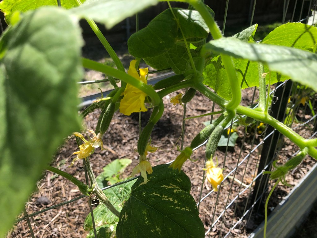 By the way, those cucumbers are 4″ now. I harvested a few for lunch. They are the snacking variety. I can’t get a view of the others, which are bush cucumbers. They aren’t cooperating and climbing. Still, I’ll be ass deep in cucumbers shortly.