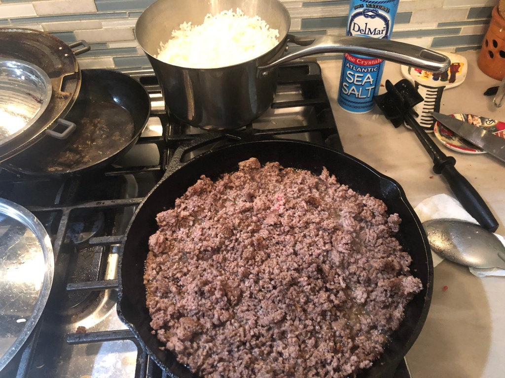 Friday, it was 3 lbs of Kroger house brand 80/20 beef, with rice.