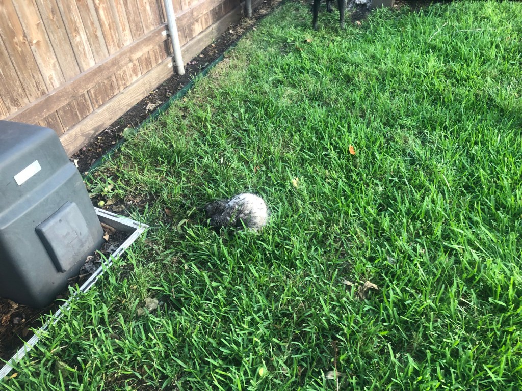 I grabbed the dogshit shovel to get rid of it, and saw it breathing. Ahhh….playing possum! Well, I’ll just scoop it and chunk it over the fence and it’ll go about it’s day. The nanosecond I touched it with the shovel, Aria grabbed it and tuned it up. Hard. Bad crunchy sounds, blood oozing from it’s mouth.