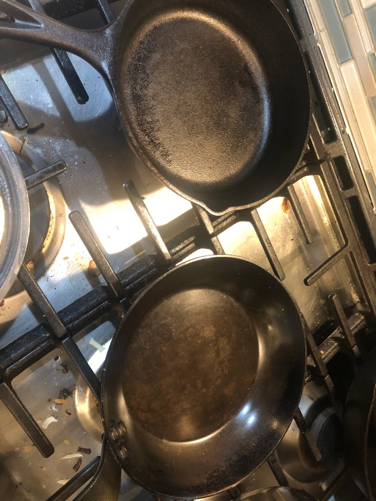 First off, flax seed oil during the seasoning process smells like ass. And it really didn’t produce a durable seasoning. Where I really saw this was in my carbon steel pan. I could saute onions in butter, and I’d get shiny spots. I’d have to put it on the fire and hit it again with oil. Way too fussy for cast iron.