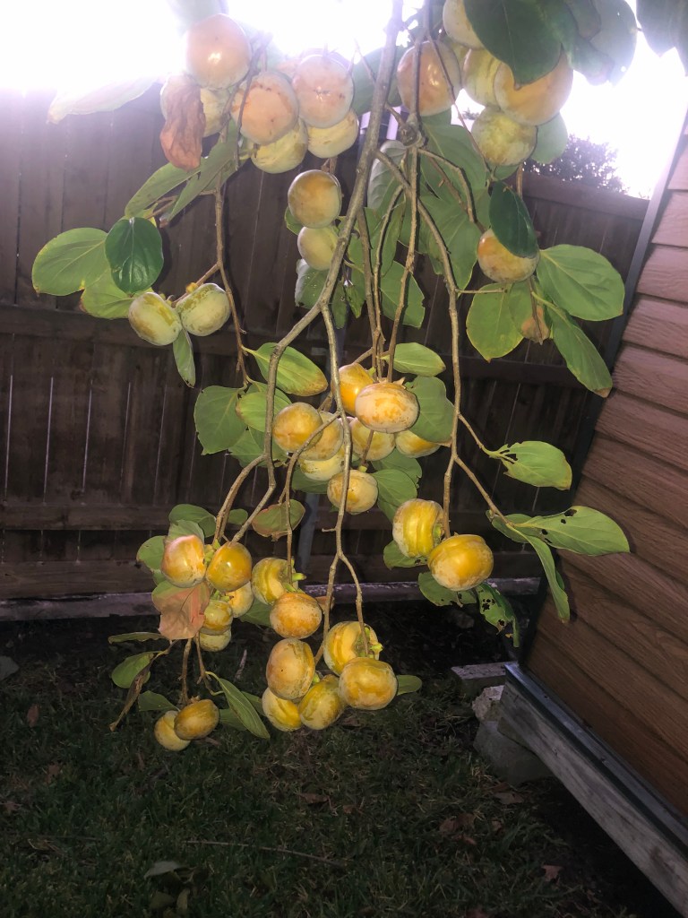 Those are persimmons. A Japanese variety with the claim to fame that they aren’t bitter when not ripe. I’m about to be up to my ass in gooey fruit waterballoons. Winston has been snacking on them. Yeah. Guess what happens when dogs eat fruit. That said, they are interesting. Very sweet, kinda sorta like a plum. Those things were $2.50 a piece at Sprouts last year.