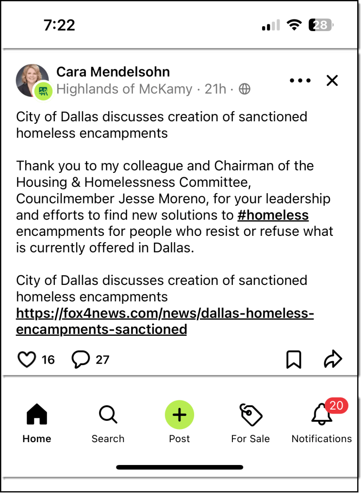 “It’s documented across this country what it costs for someone to be homeless in a city for city and county services. We talk regularly about outreach workers, the marshals, code compliance, integrated public services, the police, the community courts and even the economic development impacts. I know I’ve had businesses leave District 12 and move to Plano because of homelessness,” she said.