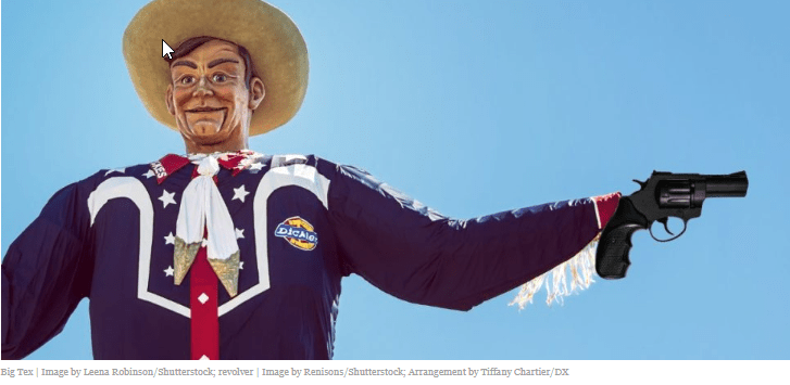 The fair is this weekend. Big Tex won’t be packing. Only the “indigenous population” will have guns.