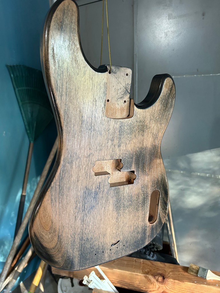 The black stain to enhance the grain didn’t work as I expected, but it added some character that I can work with. The sealer really brought this out. The pick guard on this P-bass will cover up the shadow to the right of the pickup. The rest should look cool with blue or dark green coloring. As I look at it, if the color doesn’t work like I want, I can do black on the back and sides, which will leave a colored highlight around the pick guard. I can also darken the color with some black. That’s the cool thing about lacquer. You generally do about 2-3 coats for color, then clearcoat. So you can adjust during the process.
