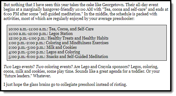 Coloring? Legos? Milk and Cookies? This is an expensive university and those attending are considered adults. Wow. These are our future leaders? But nothing beats this: