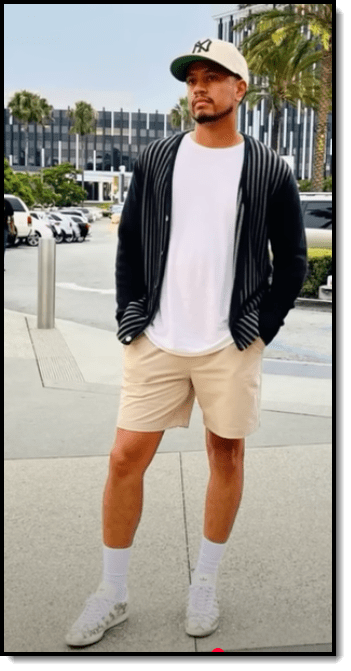 What looks worse if is the socks and shoes are black. And while I’m at it, no sandals and socks, unless you’re in your 90s. By the way, that’s a dopey getup on my man above. I’m not a cardigan and shorts guy. It makes you look like mommy dressed you.