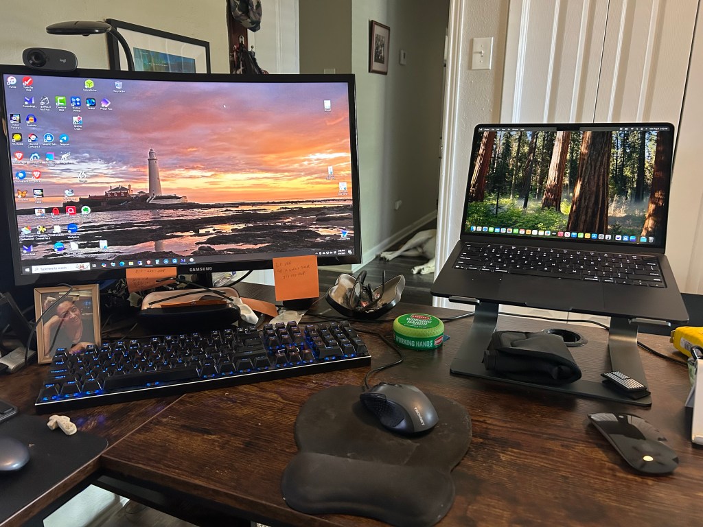 Glad I bought the Mac. I moved the laptop stand from my second desk to the my primary one, and planted the Mac on it. There’s another reason for that. I’m writing this on my Mac. I’m doing this because the Window machine is doing something – antivirus I think, that’s jamming me up. Until it does whatever it’s doing, my iCloud won’t sync images from my phone. I fired up the Mac, and everything worked.