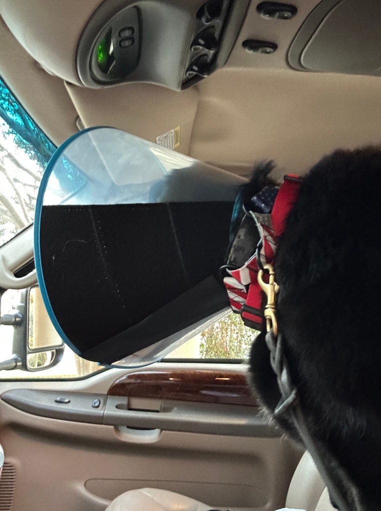 She’s supposed to keep this thing on for ten days. At least the Vet said I could take it off if she was with me, and I could make sure she doesn’t mess with her stitches. So when I got home, I took it off so she could eat.