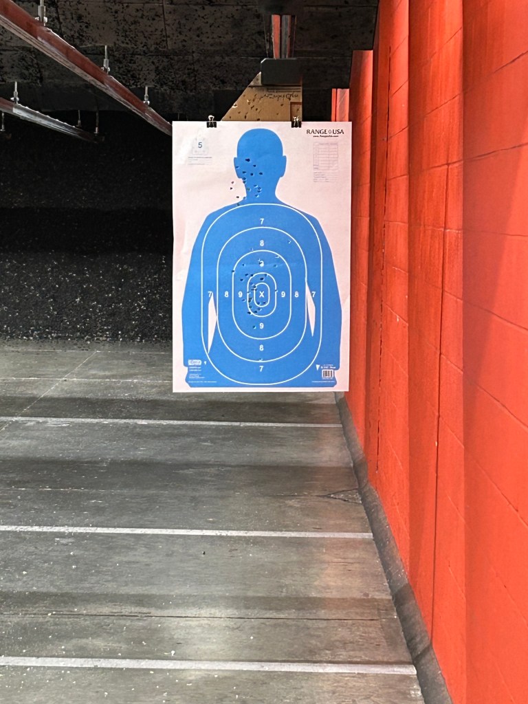 I got three targets, and planned on one per gun. First at five yards, then at seven. I’m not target shooting as much as practicing aim fast, shoot.