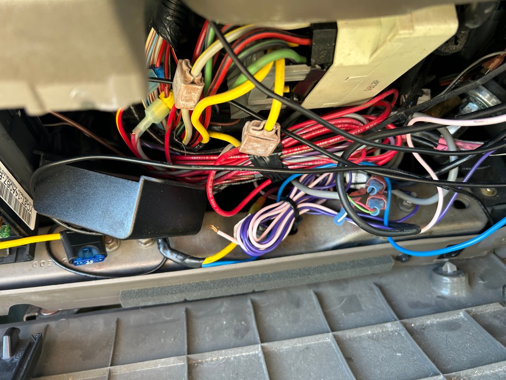 The purple and pink are from the radio, not used. They are for switching the backup cam I didn’t install. The red, yellow and the rest are the trailer brakes and the compressor. I need to remove the trailer brakes. I’ll never tow anything that needs them. I spent way too much time poking around trying to figure out where they all go. The big yellow one is the compressor feed.