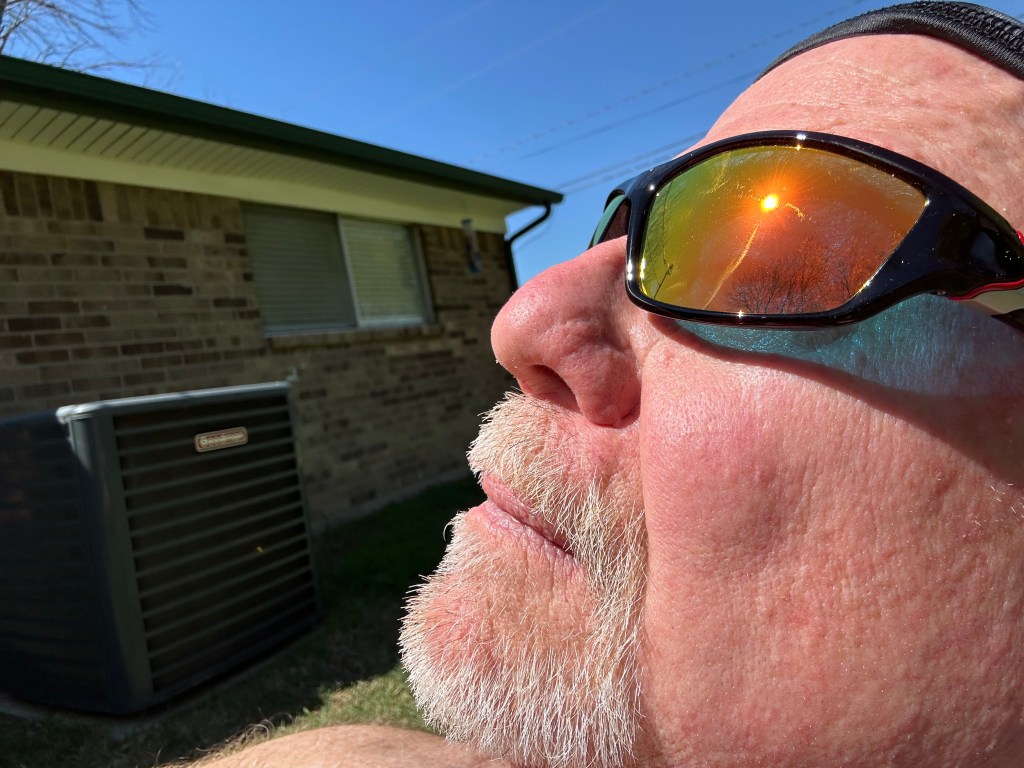 I sit out 15 minutes front, 15 minutes back every day to get a base tan. Why? So when it’s intense, I don’t wind up with sunburns when I exercise or simply walk to the store from my car. It’s pretty intense here. A couple errands, you’ll get a burn, especially if you aren’t wearing a hat on your bald noggin.