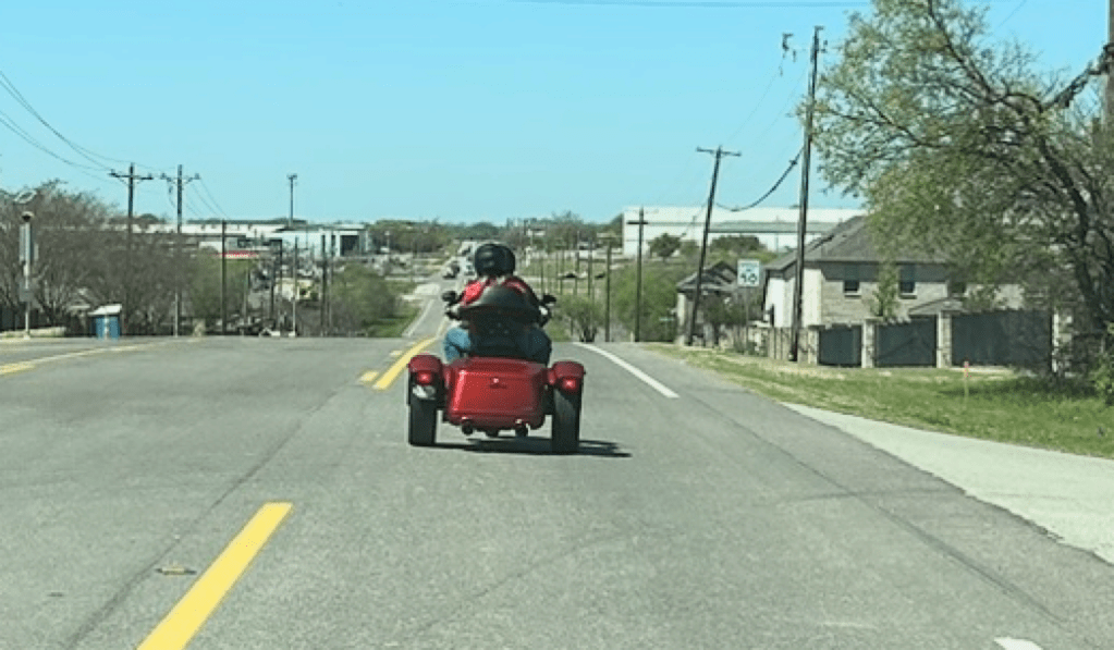 A trike. The old lady on back. Going 10 mph under the speed limit. When we stopped at the light, I noticed he had a no-shit sippy cup in a holder on his handlebar. This is why they get run off the road or hit. Slow. Distracted. Not paying attention. There were trikes like this, and a few of those dopey Can-Ams mixed in with the rest of the non-driving fools.